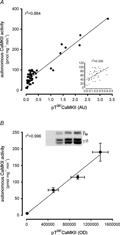 (Rose 2006) [1]. In vitro autonomous Ca2+–calmodulin-dependent protein kinase II activity is positively related to phosphorylation at Thr287 Correlation between Ca2+–calmodulin-dependent protein kinase II (CaMKII) phosphorylation at Thr287 and autonomous CaMKII activity from skeletal muscle samples taken before and during exercise (A; r 2 = 0.884, P < 0.01) and from basal skeletal muscle extracts (n = 4) manipulated to differing levels of phosphorylation by incubation with differing amounts of Ca2+ and calmodulin (B; r 2 = 0.996, P < 0.01).