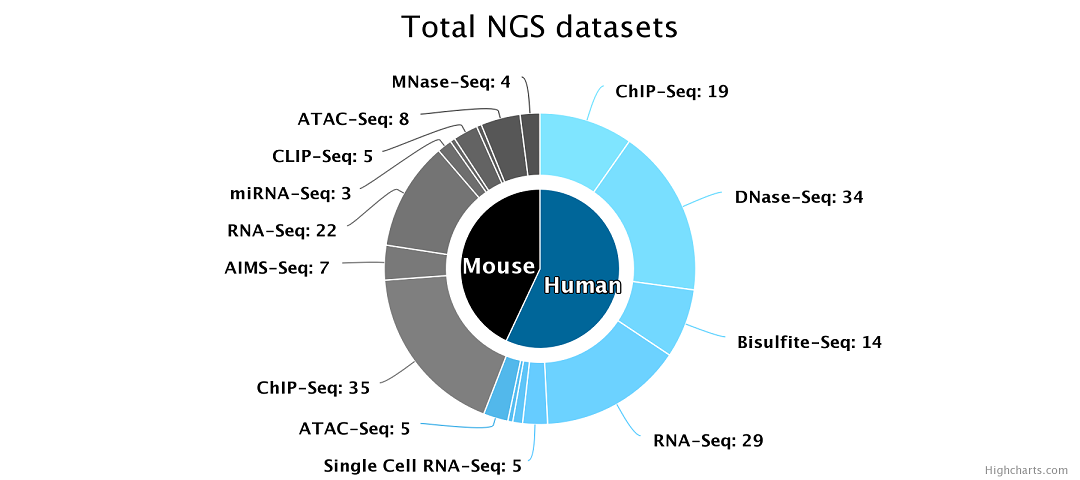 Users can efficiently search, browse and visualize the information with the well-designed user interface and server side. Track visualization of all the RNA-seq, small RNA-seq, miRNA-seq, ChIP-seq, DNase-seq, ATAC-seq and MNase-seq data on mm9, mm10, hg19, hg38 reference genome are provided through a genome visualization tool called Biodalliance.